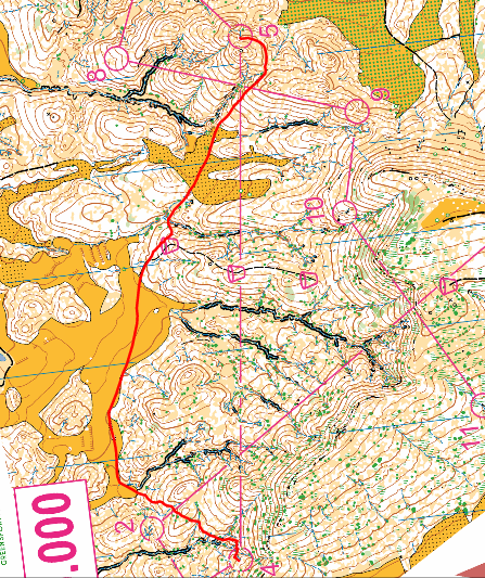 From these route and time analyses, I conclude that the left route aiming hit the nearest corner of the field, , would theoretically be advantageous. However, it necessitated a precise move steeply to the left immediately from Control 4. Consequently, this route had to be thoroughly and precisely planned before leaving control 4.